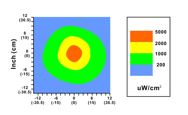 Extreme wide beam profile: 10" diameter of UV-A intensity >1000 μW/cm2at 15"