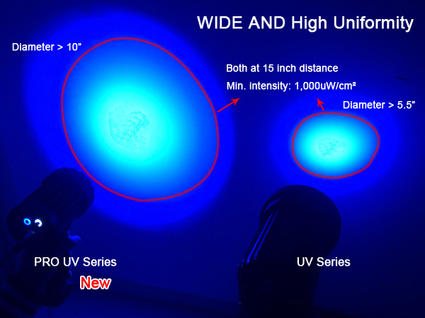 Extreme wide beam profile: 10" diameter of UV-A intensity >1000uW/cm2 at 15"